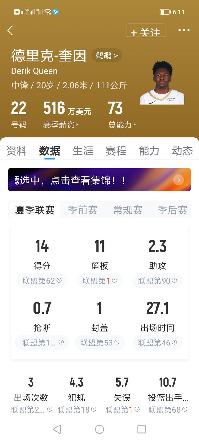 夏联阶段,他场均可出场27.1分钟,场均据是14分11篮板2.3助攻1盖帽,投篮命中率43.8%,三分命中率50%。